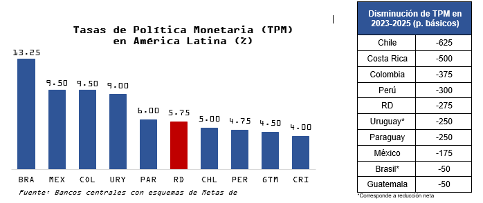 El Banco Central de la República Dominicana (BCRD), en su reunión de política monetaria de febrero de 2025, decidió mantener su tasa de interés de política monetaria (TPM) en 5.75 % anual. Asimismo, la tasa de la facilidad permanente de expansión de liquidez (Repos a 1 día) permanece en 6.25 % anual, mientras que la tasa de depósitos remunerados (Overnight) continúa en 4.50 % anual.
