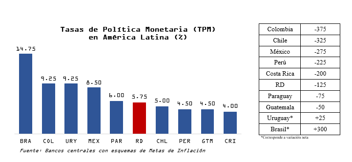 El Banco Central de la República Dominicana (BCRD), en su reunión de política monetaria de mayo de 2025, decidió mantener su tasa de interés de política monetaria (TPM) en 5.75 % anual. Asimismo, la tasa de la facilidad permanente de expansión de liquidez (Repos a 1 día) permanece en 6.25 % anual, mientras que la tasa de depósitos remunerados (Overnight) continúa en 4.50 % anual.