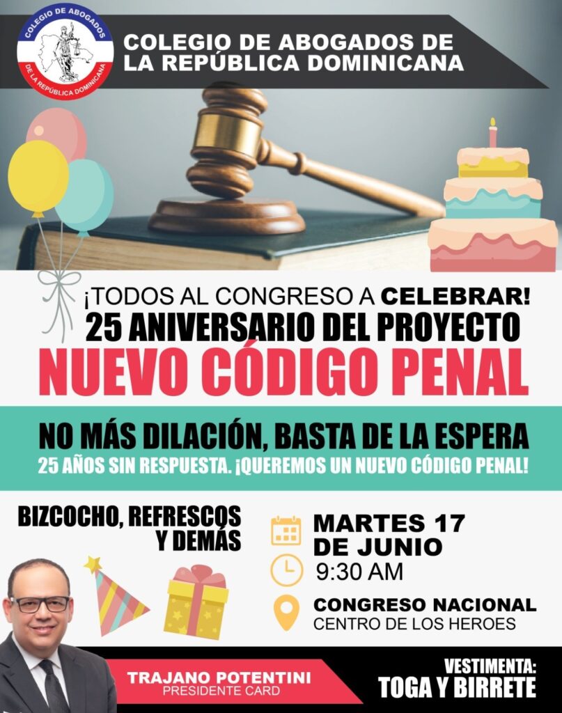 Santo Domingo, República Dominicana 17 de junio de 2025. El Colegio de Abogados de la República Dominicana (CARD), encabezado por su presidente Trajano Potentini, convoca de manera urgente y enérgica a toda la comunidad jurídica del país a participar en un acto de protesta conmemorativo por el 25 aniversario del proyecto del Nuevo Código Penal, a celebrarse este martes 17 de junio a las 9:30 de la mañana, frente al Congreso Nacional, en el Centro de los Héroes.