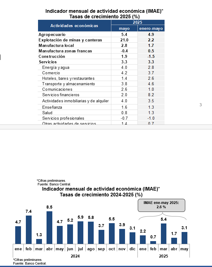 Al analizar el resultado acumulado del IMAE en enero-mayo de 2025, se observan variaciones interanuales positivas en la agropecuaria, explotación de minas y canteras, manufactura local, manufactura de zonas francas, así como en el sector servicios en su conjunto. Dentro de este último, sobresalen las actividades de servicios financieros, transporte y almacenamiento, comercio y las actividades inmobiliarias y de alquiler.