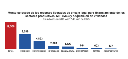 De igual manera, los recursos desembolsados de encaje legal han sido canalizados a los siguientes sectores: comercio (RD$9,289 millones), construcción (RD$4,893 millones), manufactura (RD$1,622 millones), exportación (RD$644 millones), agropecuario (RD$437 millones) y MIPYMES (RD$603 millones). Asimismo, se han colocado unos RD$2,020 millones hacia préstamos hipotecarios para la adquisición de viviendas.