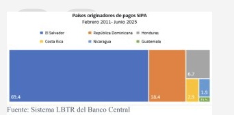 Al verificar el comportamiento de las transferencias y pagos por su país de origen, se observa que el 69.5% provienen de El Salvador y el 18.4% de la República Dominicana, mientras el 6.7% son instruidas desde Honduras, así como el 2.9%, 1.9% y 0.5% fueron iniciadas en Costa Rica, Nicaragua y Guatemala, respectivamente. En el caso de El Salvador la actividad transaccional está impulsada principalmente por el uso de la plataforma electrónica TRANSFER 365 para realizar operaciones del SIPA.