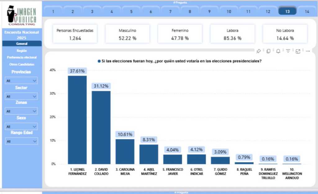 Si las elecciones presidenciales se realizaran hoy, Leonel Fernández, del partido Fuerza del Pueblo (FP), se perfila como el gran favorito con un 37.61 % de intención de voto. Le sigue David Collado, del Partido Revolucionario Moderno (PRM), con 31.12 %, mientras que Abel Martínez, del Partido de la Liberación Dominicana (PLD), obtendría apenas 8.31 %, según los datos revelados por la firma Imagen Pública