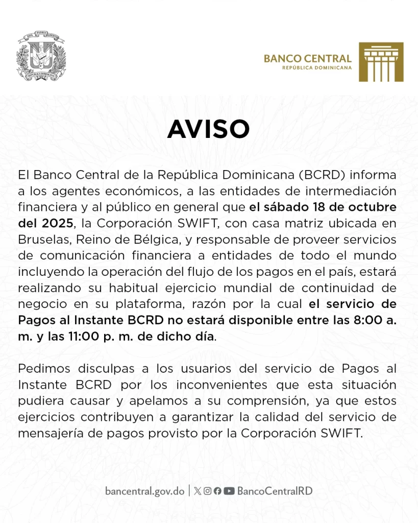 El Banco Central de la República Dominicana (BCRD) informó, a través de un comunicado oficial, que mañana sábado 18 de octubre de 2025 la Corporación SWIFT, cuya oficina matriz se encuentra en Bruselas, Reino de Bélgica, y que es responsable de proveer servicios de comunicación financiera a entidades de todo el mundo, incluyendo la operación del flujo de pagos en el país, realizará su ejercicio mundial habitual de continuidad de negocios en su plataforma.