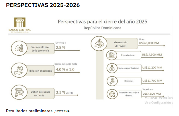 En materia de generación de divisas, pronosticó que “la economía dominicana alcanzaría un monto alrededor de US$46,000 millones, provenientes principalmente de exportaciones por unos US$14,900 millones, ingresos por turismo por US$11,200 millones y remesas por unos US$ 11,700 millones. Adicionalmente, la inversión extranjera directa (IED) superaría por cuarto año consecutivo los US$ 4,000 millones, alcanzando en 2025 más de US$ 4,800 millones, suficiente para cubrir un déficit de cuenta corriente que se ubicaría en 2.5 % del PIB”.