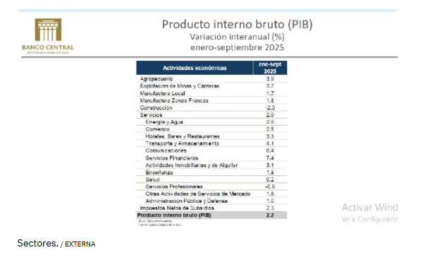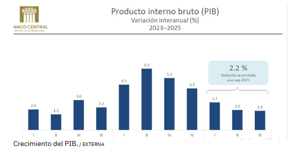 El gobernador del Banco Central (BCRD), Héctor Valdez Albizu, informó hoy que el crecimiento de la economía dominicana se ha situado en un 2.2% de su producto interno bruto (PIB), a septiembre, mientras los fundamentos se mantienen fuertes, con una saldo de inversión extranjera directa de US$4,000 millones en estos nueve meses y un cierre proyectado de US$4,800 millones en divisas este año 2025.