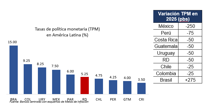 El Banco Central de la República Dominicana (BCRD), en su reunión de política monetaria de octubre de 2025, decidió reducir su tasa de interés de política monetaria (TPM) en 25 puntos básicos, de 5.50 % a 5.25 % anual. Asimismo, la tasa de la facilidad permanente de expansión de liquidez (Repos a 1 día) se reduce de 6.00 % a 5.75 % anual. Por otro lado, se decidió mantener invariable la tasa de depósitos remunerados (Overnight) en 4.50 % anual.