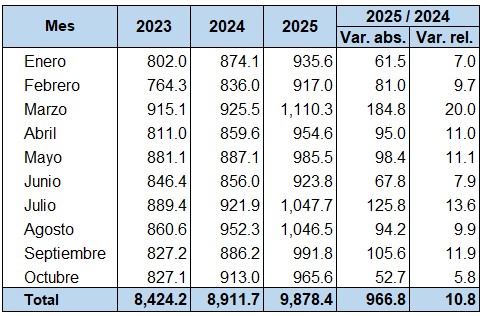 Santo Domingo, RD. El Banco Central de la República Dominicana (BCRD) informa que, entre enero y octubre de 2025, las remesas recibidas alcanzaron la cifra de US$9,878.4 millones, aumentando US$966.8 millones (10.8 %) en comparación con el mismo período del año anterior. Particularmente, en el mes de octubre se recibieron US$965.6 millones, un incremento de US$52.7 millones(5.8 %) respecto a octubre de 2024. Cabe destacar que, estos recursos suministrados por la diáspora dominicana en el exterior tienen un efecto multiplicador sobre el consumo, la inversión y el financiamiento de los sectores más vulnerables del país.