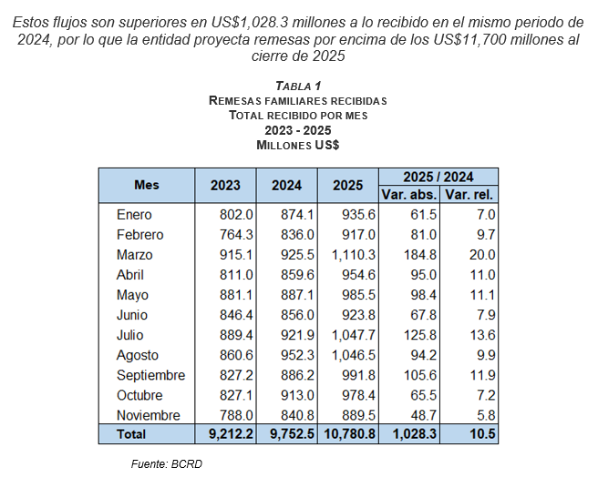 Santo Domingo, RD. El Banco Central de la República Dominicana (BCRD) informa que, entre enero y noviembre de 2025, las remesas recibidas alcanzaron la cifra de US$10,780.8 millones, aumentando US$1,028.3 millones (10.5 %) en comparación con el mismo período del año anterior. Particularmente, en el mes de noviembre se recibieron US$889.5 millones, un incremento de US$48.7 millones (5.8 %) respecto a noviembre de 2024. Cabe destacar que, estos recursos suministrados por la diáspora dominicana en el exterior tienen un efecto multiplicador sobre el consumo, la inversión y el financiamiento de los sectores más vulnerables del país.