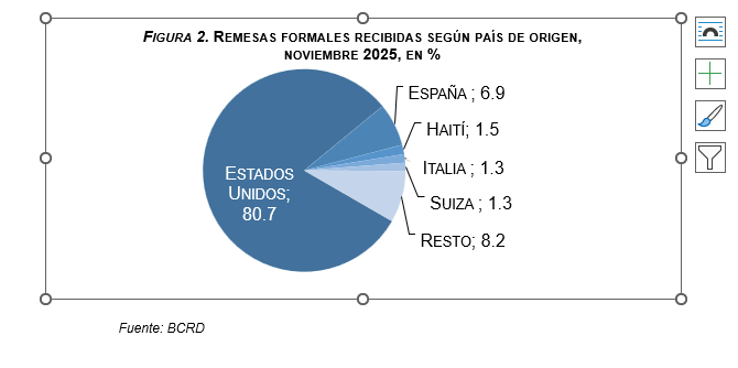 El BCRD destaca también la recepción de remesas por canales formales desde otros países en el mes de noviembre, como España, por un valor de US$56.9 millones, un 6.9 % del total, siendo este el segundo país en cuanto al total de residentes de la diáspora dominicana en el exterior se refiere. Por su parte, Haití contribuyó con 1.5 % del total de flujos recibidos, mientras que Italia y Suiza aportaron el 1.3 % cada uno. En el resto de la recepción de remesas se distinguen países como Canadá y Francia, entre otros.