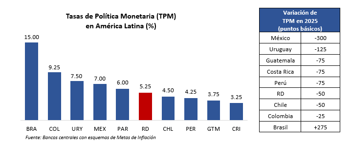 El Banco Central de la República Dominicana (BCRD), en su reunión de política monetaria de enero de 2026, decidió mantener sin cambios su tasa de interés de política monetaria (TPM), en 5.25 % anual. Asimismo, la tasa de la facilidad permanente de expansión de liquidez (Repos a 1 día) permanece en 5.75 % anual, mientras la tasa de depósitos remunerados (Overnight) continúa en 4.50 % anual