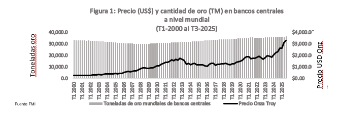 En un entorno internacional marcado por elevada incertidumbre financiera, tensiones geopolíticas persistentes y un proceso de recomposición del sistema monetario global, el debate sobre el oro como activo de refugio ha recobrado relevancia. En particular, ha aumentado la atención sobre el rol de los bancos centrales como compradores de este activo dentro de un contexto de fragmentación global y de máximos históricos del precio del oro, que este año ha llegado a superar los US$5,000 por onza troy, lo que representa un incremento cercano al 75 % respecto al cierre de enero de 2025.