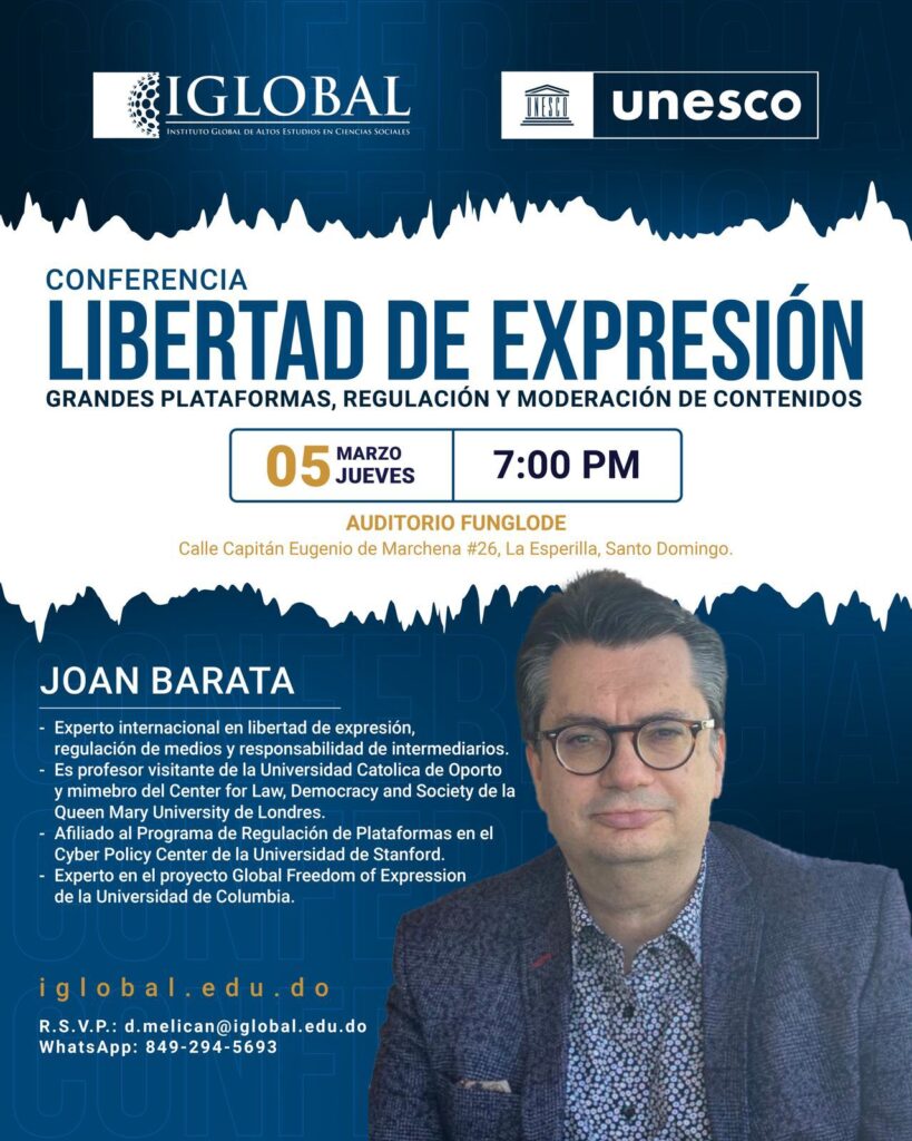 La actividad de acceso libre tendrá lugar el jueves 5 de marzo a las 7:00 p. m. en el auditorio de FUNGLODE, en Santo Domingo, y contará con la participación del reconocido especialista internacional Joan Barata, uno de los expertos más influyentes en materia de libertad de expresión, regulación de medios y responsabilidad de intermediarios digitales.