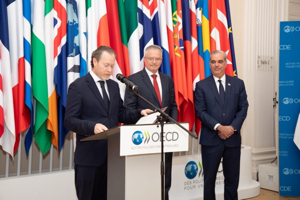 París, Francia. – En presencia del presidente Luis Abinader, el canciller Roberto Álvarez y el secretario general de la Organización para la Cooperación y el Desarrollo Económico (OCDE), Mathias Cormann, firmaron un Memorando de Entendimiento con el que las partes formalizan su acercamiento y buscan fomentar la cooperación, impulsar el intercambio de buenas prácticas, así como apoyar el fortalecimiento de políticas públicas conforme a estándares internacionales.
